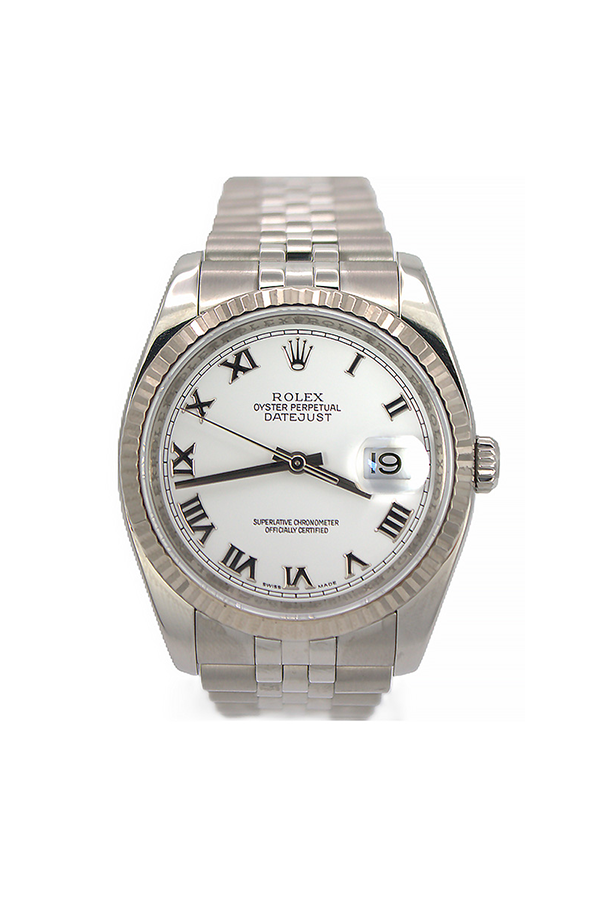 36mm, White Roman Dial, White Gold Fluted Bezel, Stainless Steel Jubilee Bracelet, Sapphire Crystal, approximately 48 Hours of Power Reserve, 3135 Caliber Movement, Water Resistance 10ATM