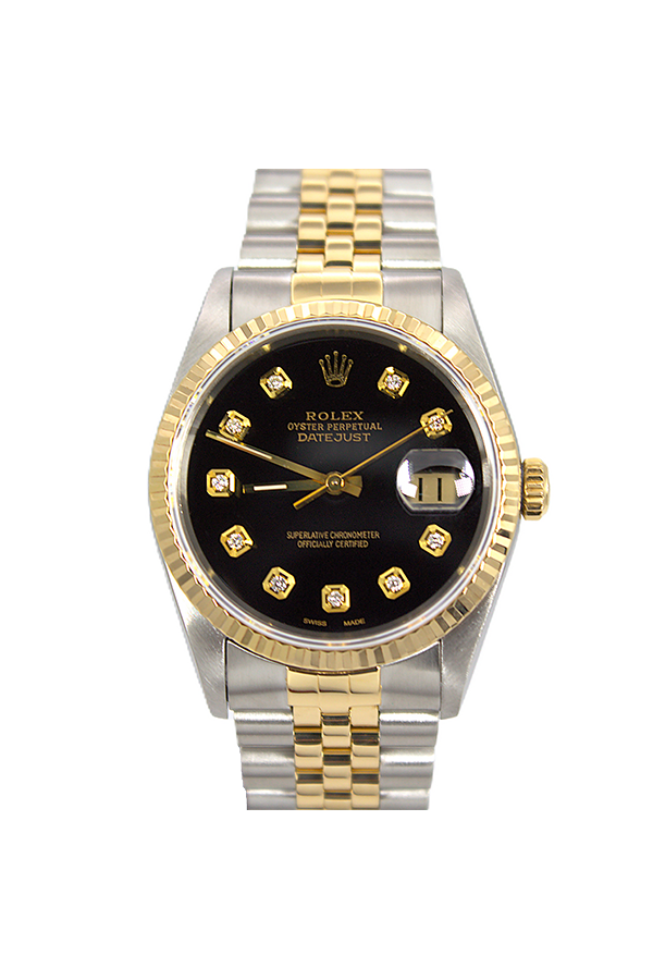 36mm Black Diamond Dial, Yellow Gold Fluted Bezel, Two Tone Stainless Steel & Yellow Gold Jubilee Bracelet, Sapphire Crystal, approximately 42 Hours of Power Reserve, 3135 Caliber Movement, Water Resistance 10ATM.