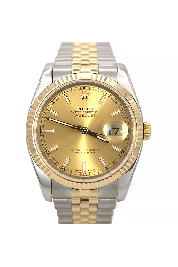 36mm Champagne Index Dial, Yellow Gold Fluted Bezel, Two-Tone Stainless Steel & Yellow Gold Jubilee Bracelet, Sapphire Crystal, approximately 48 Hours of Power Reserve, 3135 Caliber Movement, Water Resistance 10ATM.