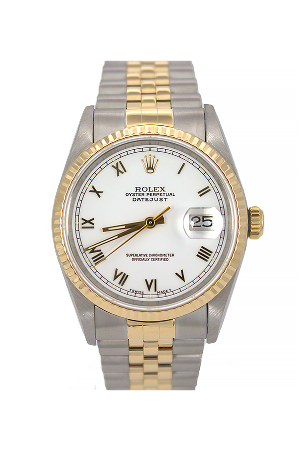 36mm White Roman Dial, Yellow Gold Fluted Bezel, Two-Tone Stainless Steel & Yellow Gold Jubilee Bracelet, Sapphire Crystal, approximately 42 Hours of Power Reserve, 3135 Caliber Movement, Water Resistance 10ATM.