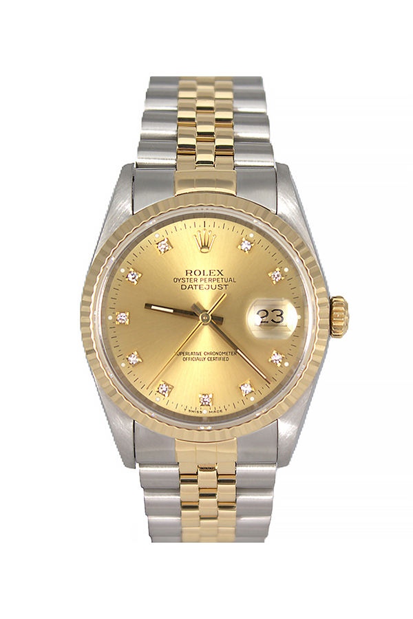 36mm Champagne Diamond Dial, Yellow Gold Fluted Bezel, Two-Tone Stainless Steel & Yellow Gold Jubilee Bracelet, Sapphire Crystal, approximately 48 Hours of Power Reserve, 3135 Caliber Movement, Water Resistance 10ATM.