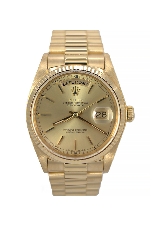 36mm, Champagne Index Dial, Yellow Gold Fluted Bezel, 18 Karat Yellow Gold President Bracelet, Sapphire crystal Approximately 48 Hours of Power Reserve, 3055 Caliber Movement, Water Resistance 10ATM.